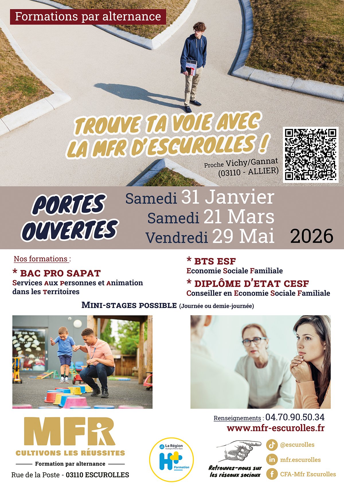 MFR d'EscurollesFormation par alternanceEconomie Sociale FamilialeIntervenir auprès de publics en difficultés comme par exemple les personnes âgées, les jeunes, les personnes en situation de précarité, de handicap, les familles, les personnes en situation irrégulière ou d'origines d'étrangères...BTS ESFDE Conseiller en Economie Sociale et FamilialeFormations à la carteOffrir des formations dans des domaines divers en s’adaptant aux besoins des entreprises (plan de formation) ou des particuliers.Formations à la demandeContactez-nous pour un programme particulier !VAEValidation des acquis d'expériencesServices aux PersonnesExercer une activité dans les secteurs social, services aux personnes, santé, administratif, animation, tourisme et commerce de proximité.Bac Pro SAPAT50 % du temps en formation / 50 % du temps en milieu professionnelFormations funérairesFormations pour les différents métiers du funéraire